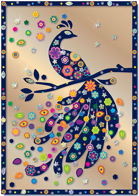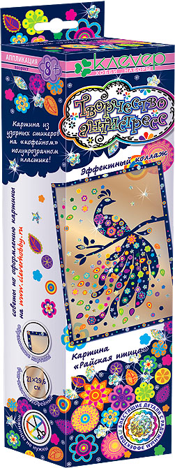 Картина-коллаж из стильных стикеров на затемнённом полупрозрачном фоне «Райская птица» понравится ребёнку старше 8 лет: он легко наклеит на пластик части рамки, силуэты ветки и чудесной птицы, а затем украсит изображение узорными и блестящими стикерами. Особенно эффектно картина смотрится на фоне узора обоев, который слегка просвечивает сквозь полупрозрачный пластик кофейного оттенка. А в рамке из багета картина-коллаж превратится в настоящий шедевр и станет ярким акцентом в любом интерьере!