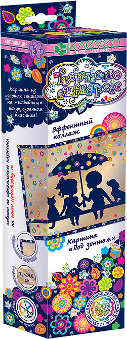 Картина-коллаж из стильных стикеров на затемнённом полупрозрачном фоне «Под зонтом» понравится ребёнку старше 8 лет: он легко наклеит на пластик части рамки, силуэты деток и зверят, а затем украсит изображение узорными и блестящими стикерами, как будто идет дождик из цветов. Особенно эффектно картина смотрится на фоне узора обоев, который слегка просвечивает сквозь полупрозрачный пластик кофейного оттенка. А в рамке из багета картина-коллаж превратится в настоящий шедевр и станет ярким акцентом в любом интерьере!