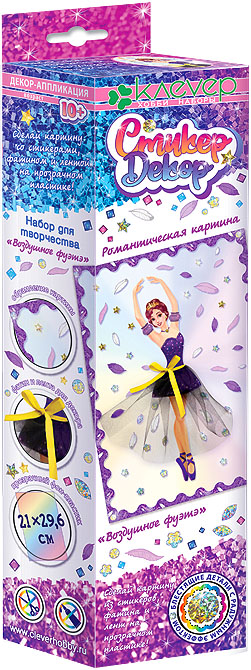 Набор "Воздушное фуэте" серии "Романтические картины" предлагает подростку старше 10 лет создать оригинальную картину из стикеров на прозрачном пластике, декорируя изображение гармонично сочетающимся с рисунком невесомым фатином и атласной лентой. Нежный сюжет - лёгкое движение в танце юной балерины среди сверкающих звёзд и парящих перьев - передаёт романтическую атмосферу радости и эффект невесомости. Изысканность сюжета сочетается с лёгкостью исполнения: по схеме наклеить на прозрачный пластик красочные детали-самоклейки и голографические стикеры, собрать на проволоку фатин и закрепить его на картине, завязать бант из ленты.