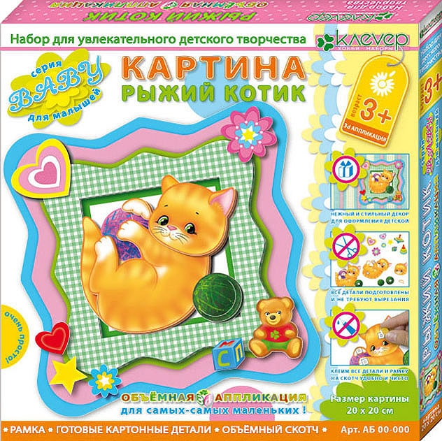 Картину с милым рыжим котиком сделать очень легко. Малышу старше 3 лет нужно только подобрать готовые детали по размеру, наклеить их послойно на фон с помощью двустороннего объёмного скотча и вместе с родителями сложить декоративную рамку. Клей и ножницы ребёнку не понадобятся. Забавные картинки славных маленьких животных декоративной серии «Бейби», которые ребёнок легко сделает сам, будут красиво смотреться на стене в детской комнате.