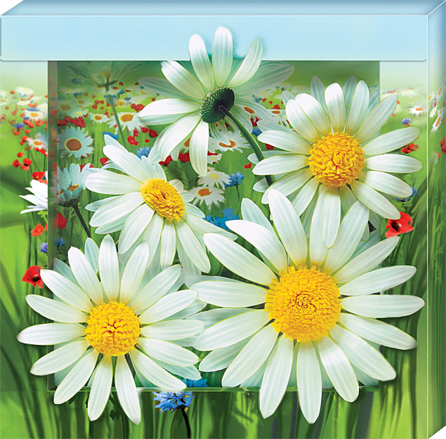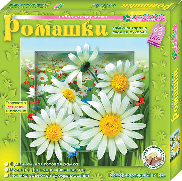 Ромашка – один из самых известных и любимых цветков, символ русской природы, цветок-предсказатель судьбы - «сбудется – не сбудется, любит – не любит…». Картину «Ромашки» дети старше 10 лет и взрослые могут сделать своими руками в технике бумагопластики с элементами квиллинга и объёмной аппликации: вырезать, изогнуть и склеить лепестки цветков из тонкой цветной бумаги при помощи тонкого двустороннего скотча, изготовить декоративные сердцевины из бумаги с помощью деревянной палочки, наклеить рамки на фон, наклеить детали на картину с помощью объёмного двустороннего скотча.