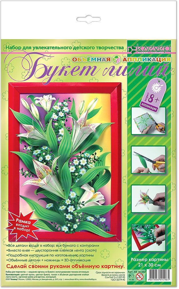 В наборе: цветная бумага с контурами для вырезания, фон, объёмный двусторонний скотч, картонная рамка, пошаговая инструкция