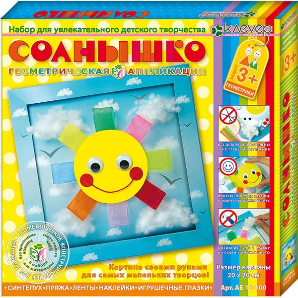 Это доброе сказочное солнышко с цветными лучиками-лентами светит в ясном небе, по которому плывут пушистые облачка. Малыш легко смастерит его сам и украсит свою комнату. В процессе работы маленький творец познакомится с разными по фактуре материалами - капроновыми лентами, пряжей, цветным картоном, самоклейкой, двусторонним прозрачным и объёмным скотчем, а наклеенные на солнышко большие игрушечные глазки с подвижными зрачками придадут живость картине.