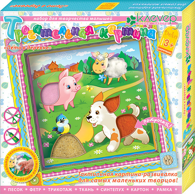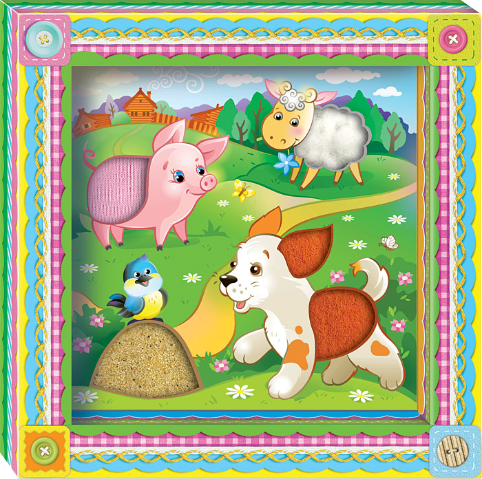 Для самых маленьких! Веселый щенок, симпатичный поросёнок и смешной барашек резвятся на летнем лугу в деревне. Если малыш потрогает пальчиком ушко щенка, он скажет: мягкое, овечка - пушистая, а если кучу песка: шершавый. Сделать такую тактильную картину-развивалку совсем просто самим, а малыш охотно примет участие: обведите контуры деталей на дне рамки, наклейте на скотч кусочки ткани, фетра, синтепуха, насыпьте песок на клейкую основу и накройте картинкой! Готово! Трогательная тактильная картина!