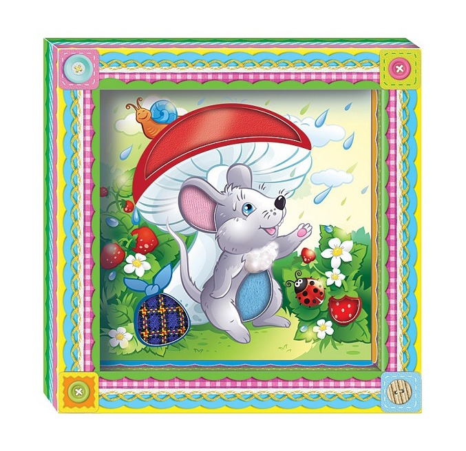 Для самых маленьких! Милая мышка спряталась от летнего дождика в зарослях земляники под шляпкой яркого гриба! Картина не простая: если малыш потрогает пальчиком ушко мышки, он скажет: мягкое, пушистое, а если шляпку грибка: гладкая, скользкая. Сделать такую тактильную картину-развивалку совсем просто самим, а малыш охотно примет участие: обведите контуры деталей на дне рамки, наклейте на скотч кусочки ткани, фетра, кожи, синтепуха и накройте картинкой! Готово! Трогательная тактильная картина!