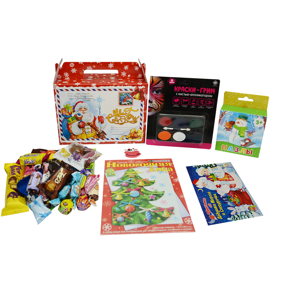 - В наборе: 22 конфеты, грим-краски, набор для творчества, письмо от Дедушки Мороза, магнит, пазл