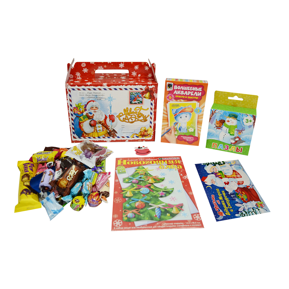 - В наборе: 22 конфеты, 2 набора для творчества, письмо от Дедушки Мороза, магнит, пазл