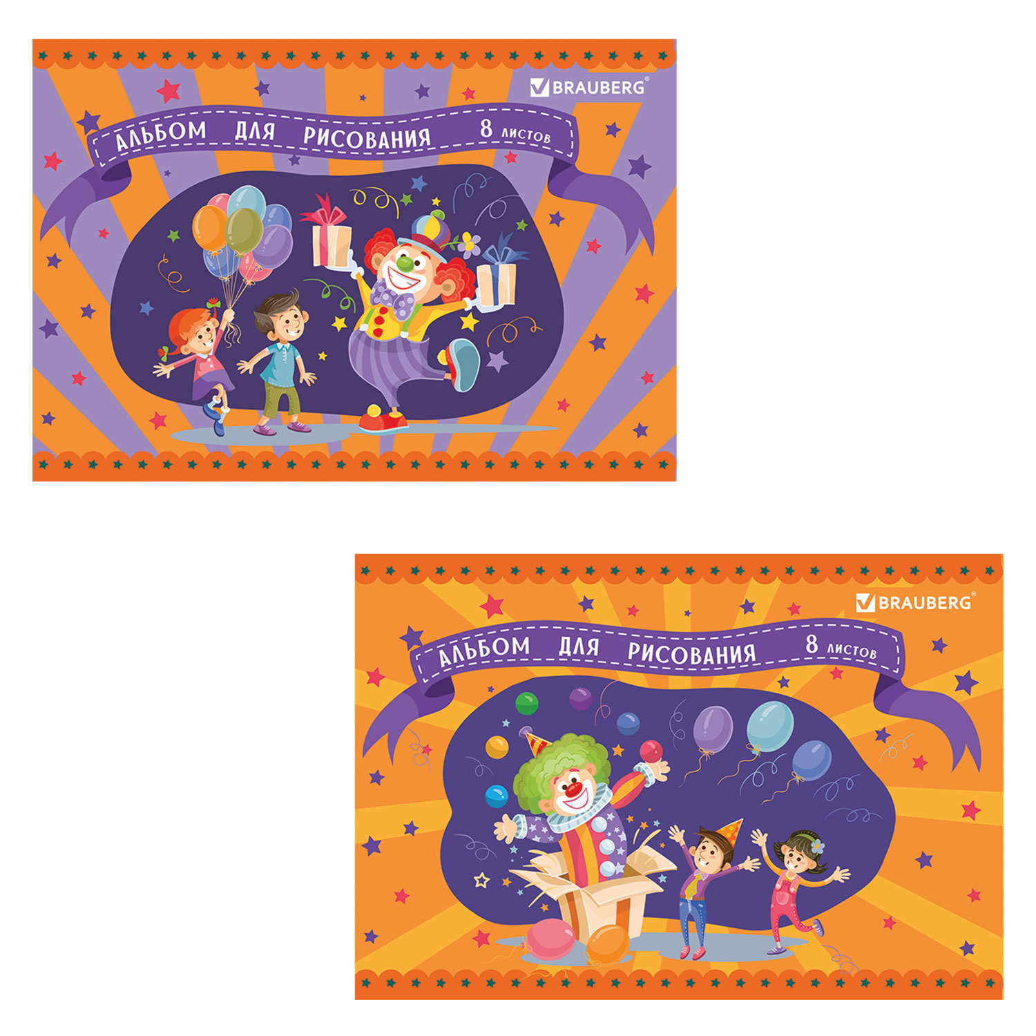 Альбом для рисования, А4, 8 листов, скоба, обложка картон, BRAUBERG, 200х283 мм, "Веселые клоуны"