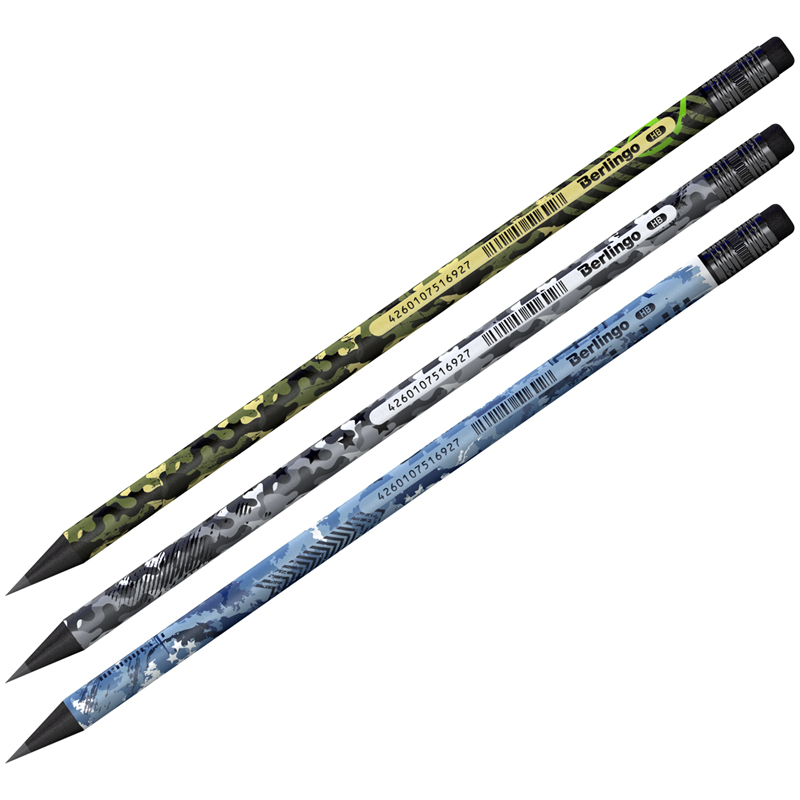 Чернографитный ударопрочный карандаш Berlingo "Military" из черного дерева,с ластиком, с заточкой. Матовое покрытие корпуса, дизайны ассорти. Не ломается при падении. Безопасен для детей, в случае разлома, не оставляет мелких и острых фрагментов. Подходит для черчения и рисования. Диаметр грифеля 2,2 мм, твердость HB, круглая форма.