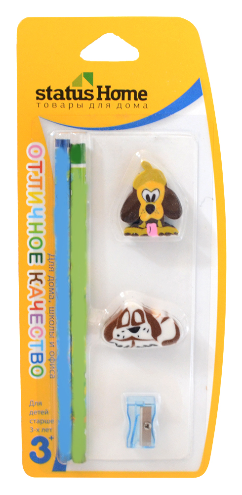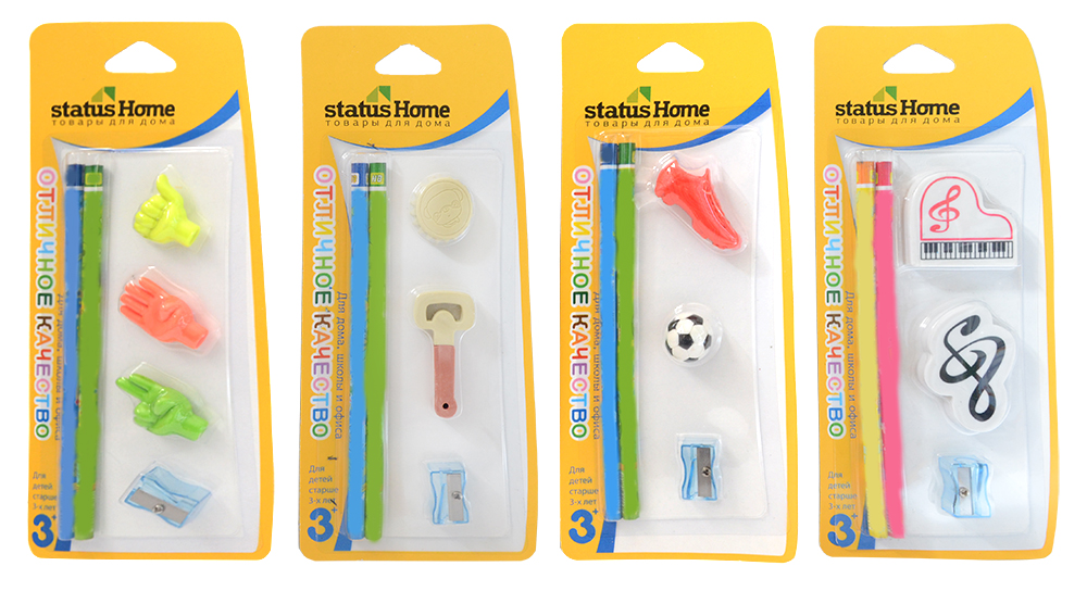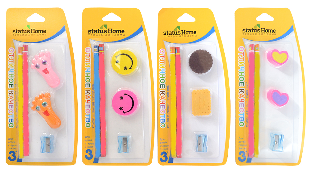 - В наборе 2 карандаша, 2 ластика и точилка в блистерной упаковке.