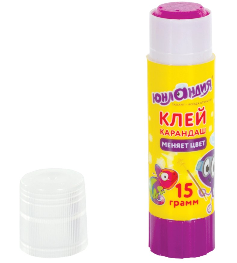 Клей-карандаш ЮНЛАНДИЯ с клеящим полимерным компонентом подкрашен пигментом, который обесцвечивается при контакте с воздухом. Слой клея на бумаге хорошо виден, что помогает наносить клей предельно точно и аккуратно.