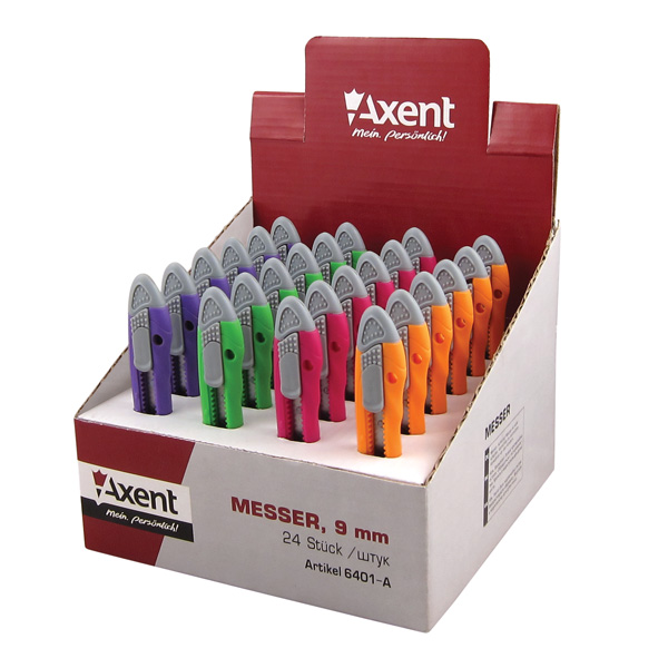 Канцелярский нож со стальным многосекционным лезвием. Эргономичный корпус из прочного пластика, механизм ступенчатой подачи лезвия. Фиксатор лезвия. Упаковка: дисплей - ассорти 4 цвета (салатовый, фиолетовый, оранжевый, розовый).