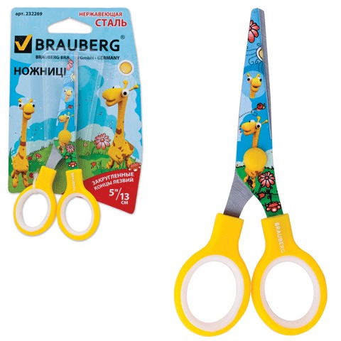 Ножницы 13 см BRAUBERG "Жирафы" с цветной печатью, жёлтые