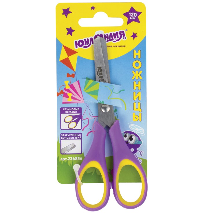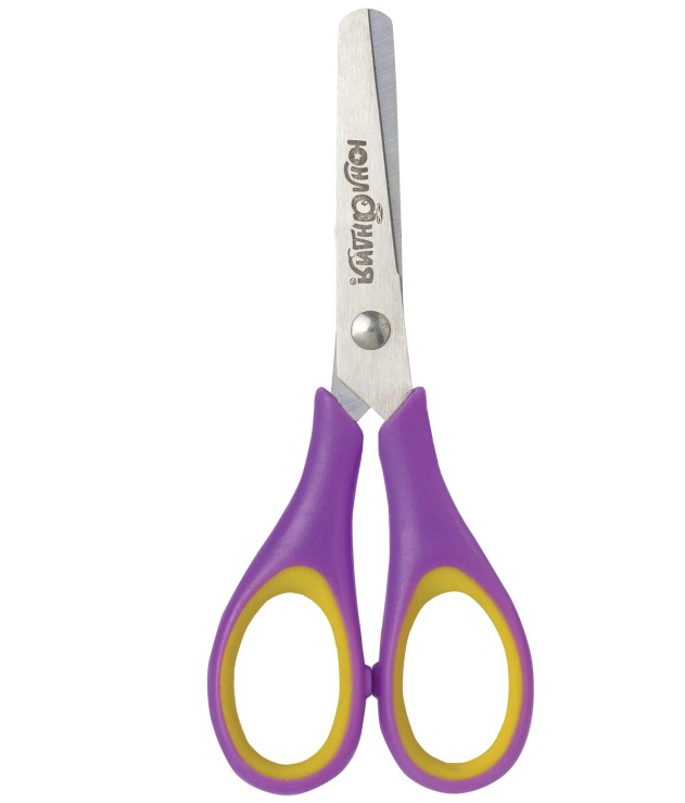 Ножницы с симметричными эргономичными ручками. Имеют удобные для пальцев резиновые вставки фиолетово-желтого цвета. Закругленные концы идеальны для безопасного использования. Незаменимы для детского творчества!