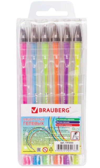Ручки гелевые, набор 6 штук BRAUBERG, "Jet", пастельные, узел 0,7 мм, линия письма 0,5 мм