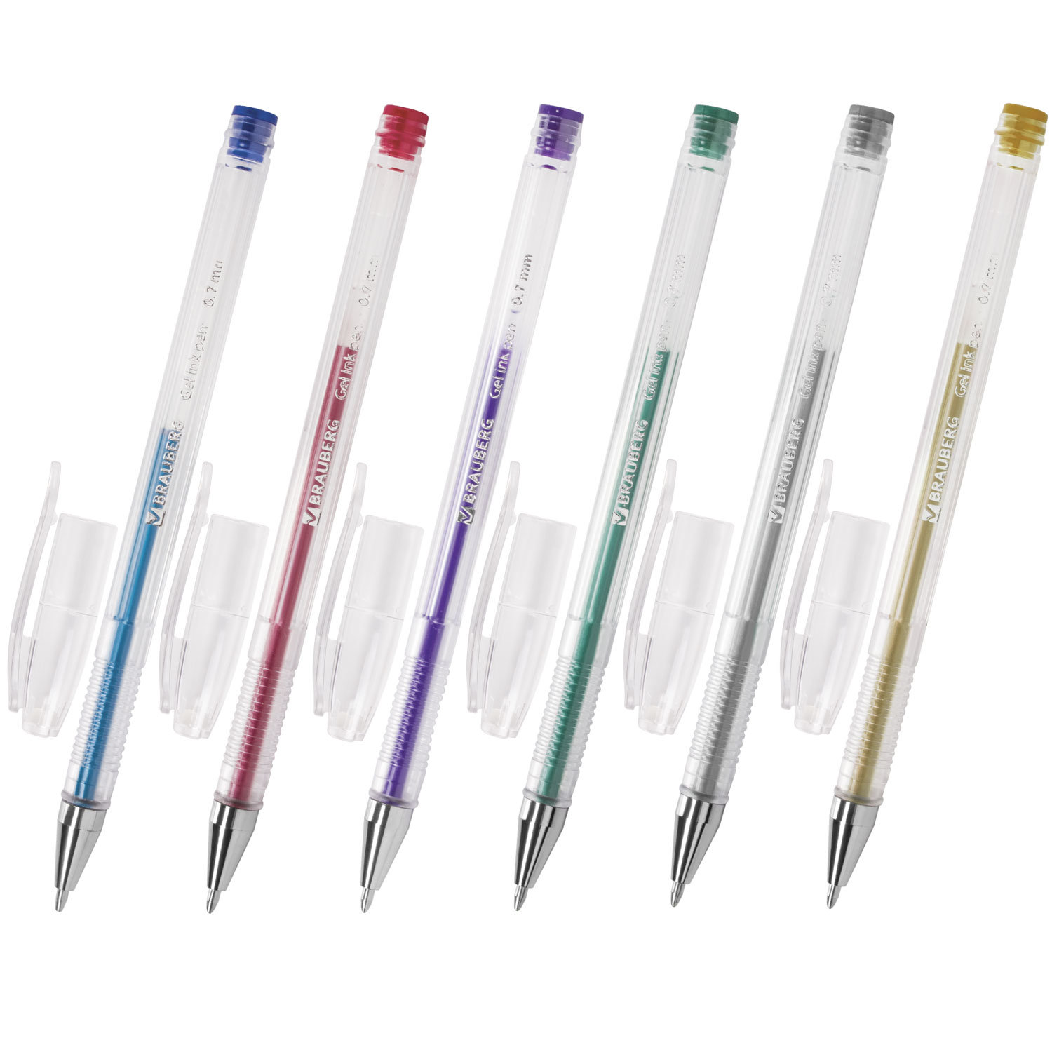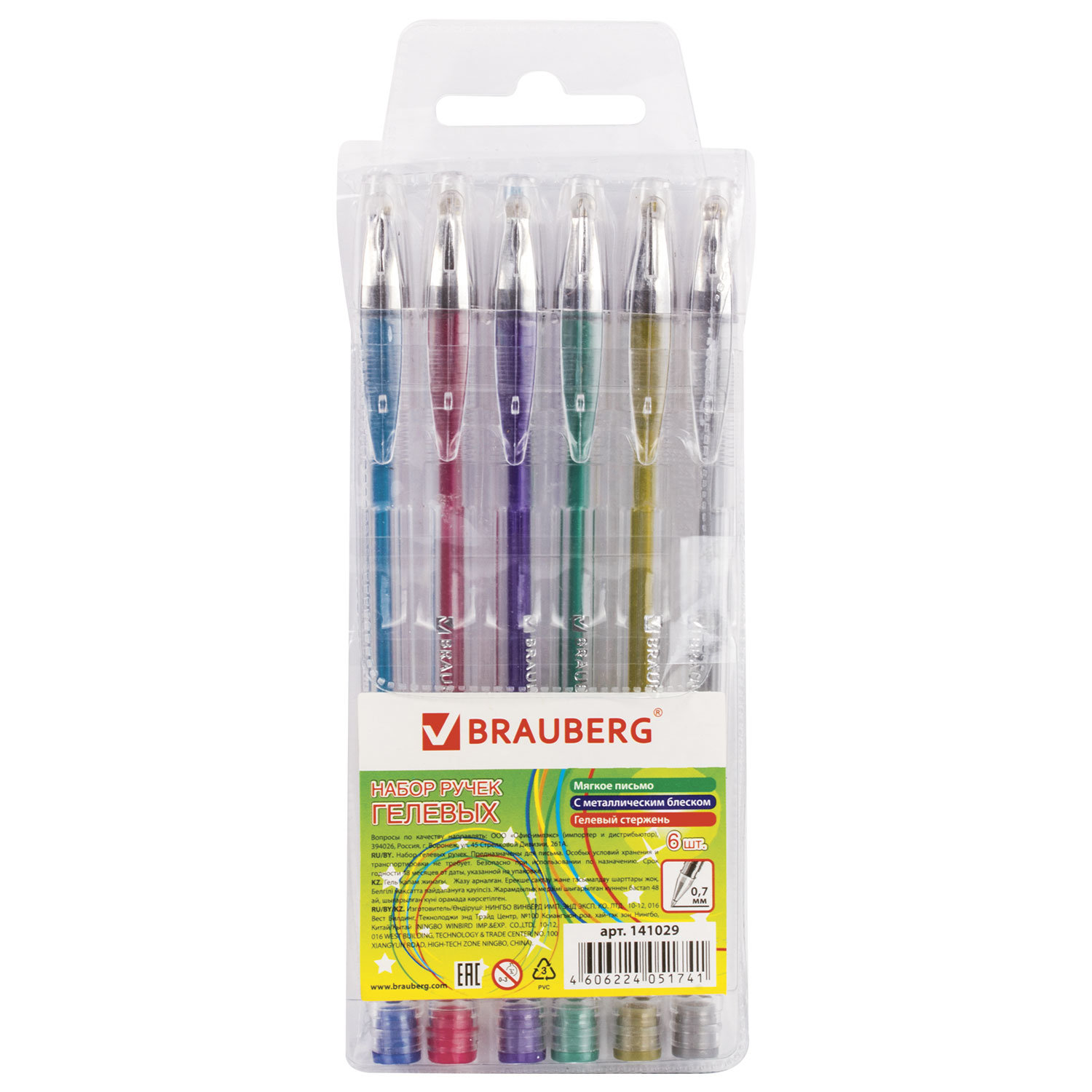 Ручки гелевые BRAUBERG, НАБОР 6 штук, "Jet", чернила металлик, узел 0,7 мм, линия письма 0,5 мм, 141029