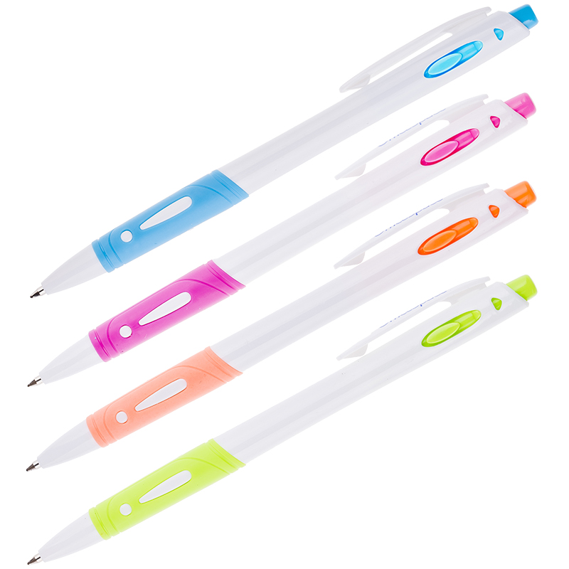 Автоматическая шариковая ручка. Непрозрачный тонкий пластиковый корпус белого цвета. Отдельные детали тонированы. Специальная резиновая накладка грип-зоны препятствует выскальзыванию ручки из пальцев.