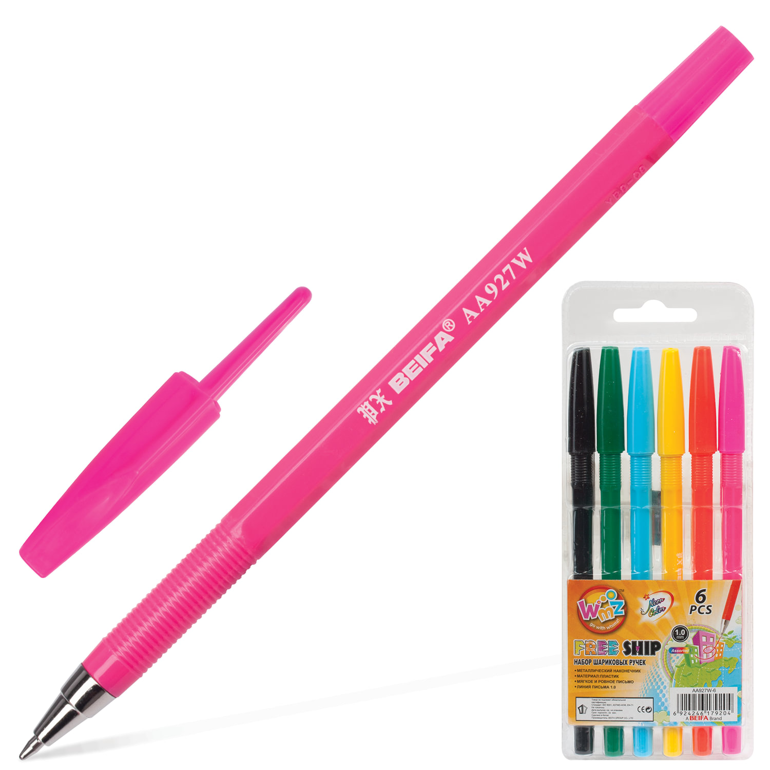 Ручки шариковые BEIFA (Бэйфа) в НАБОРЕ из 6 штук, АССОРТИ, "WMZ", узел 1,2 мм, линия письма 1 мм, AA927W-6