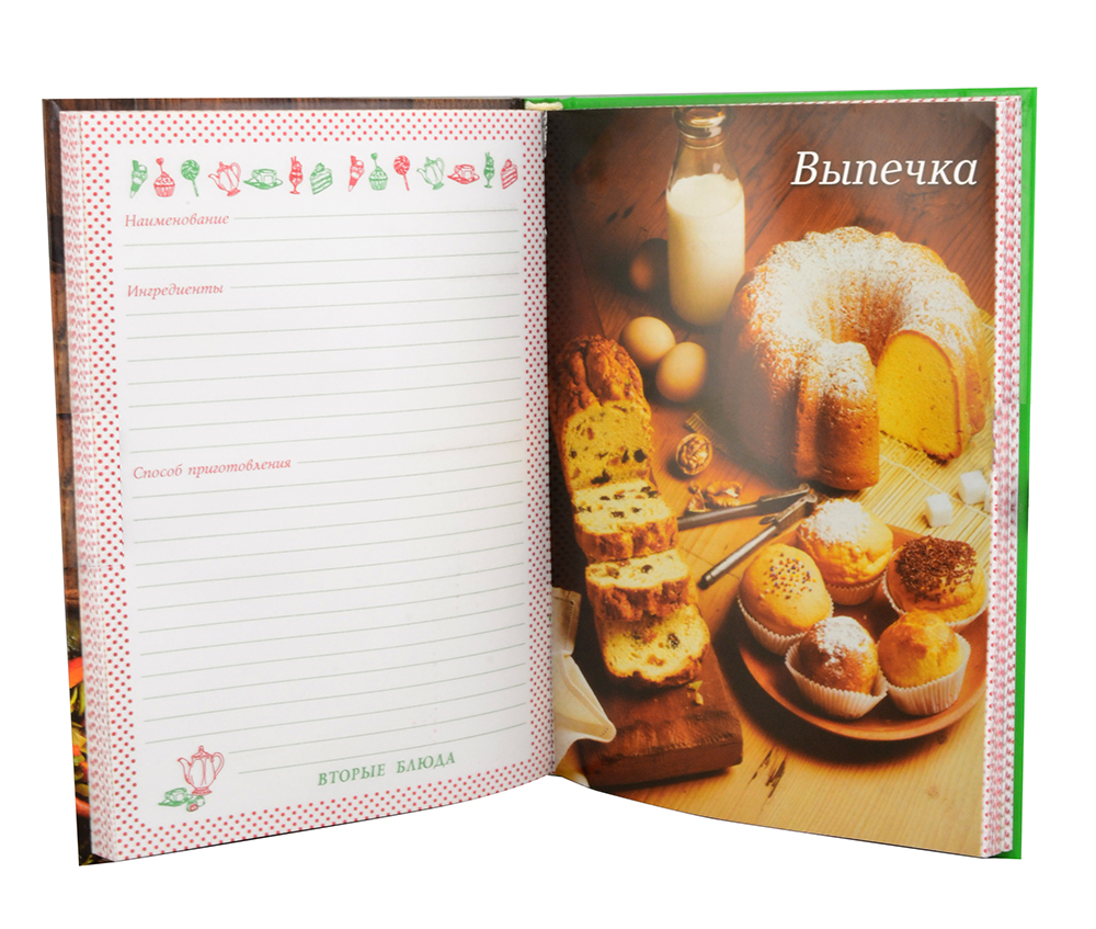 Качественная кулинарная книга для записи любимых рецептов станет Вашей лучшей помощницей. Все любимые первые блюда, салаты, десерты теперь все будут храниться в одном месте. Не нужно копаться в интернете в поиске ингридиентов, достаточно просто заглянуть в книгу, где найдете все необходимое для блюда.