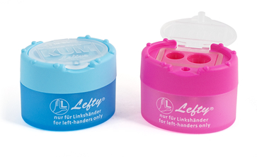 Точилка двойная с контейнером. Для левшей. Подходит для затачивания карандашей разного диаметра. Благодаря системе Click-Clack стружка остается внутри корпуса. Корпус выполнен из прочного полупрозрачного пластика, лезвия из высокоуглеродистой стали. Ассортимент цветов.