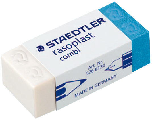 Комбинированный ластик для стирания записей. Синяя часть предназначена для стирания чернил с бумаги. Изготовлен без применения фталата и латекса. Бумажная манжетка для удобной работы. Не пачкает бумагу. Защитная целлофановая упаковка.