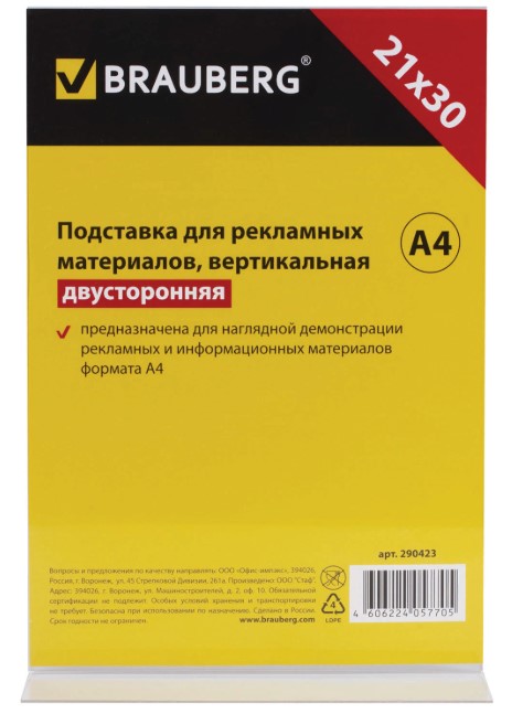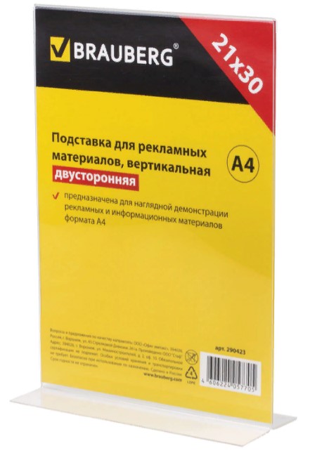 Подставка для рекламных материалов А4, вертикальная, настольная, двусторонняя, оргстекло BRAUBERG