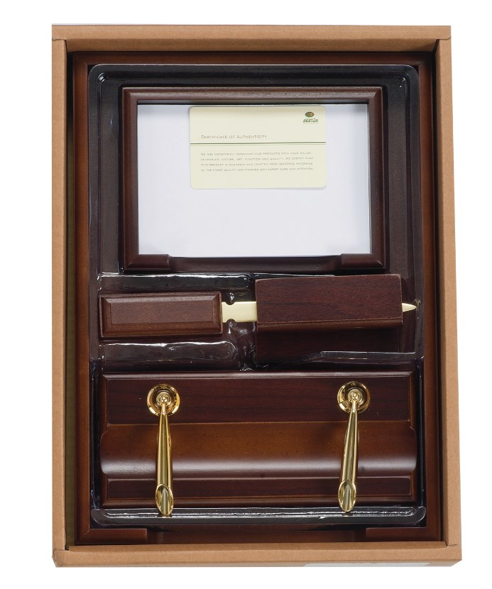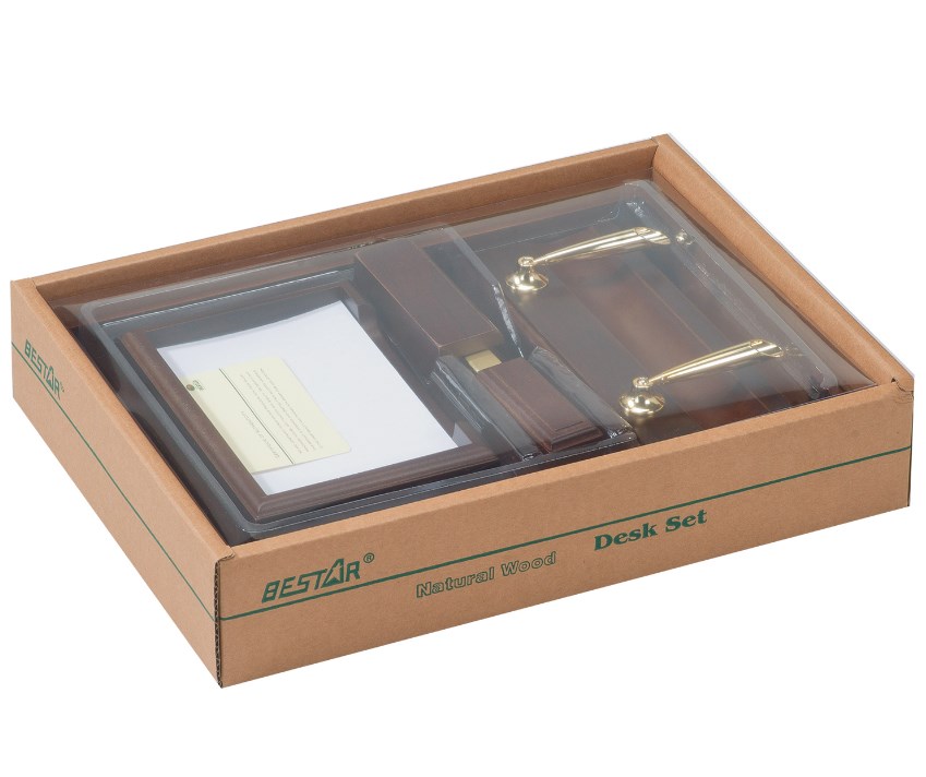 Настольный набор премиум-класса цвета "красное дерево" с золотистой фурнитурой состоит из 5 предметов и содержит самое необходимое для организации комфортного и элегантного рабочего места.