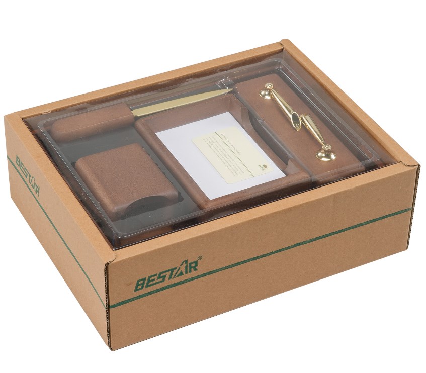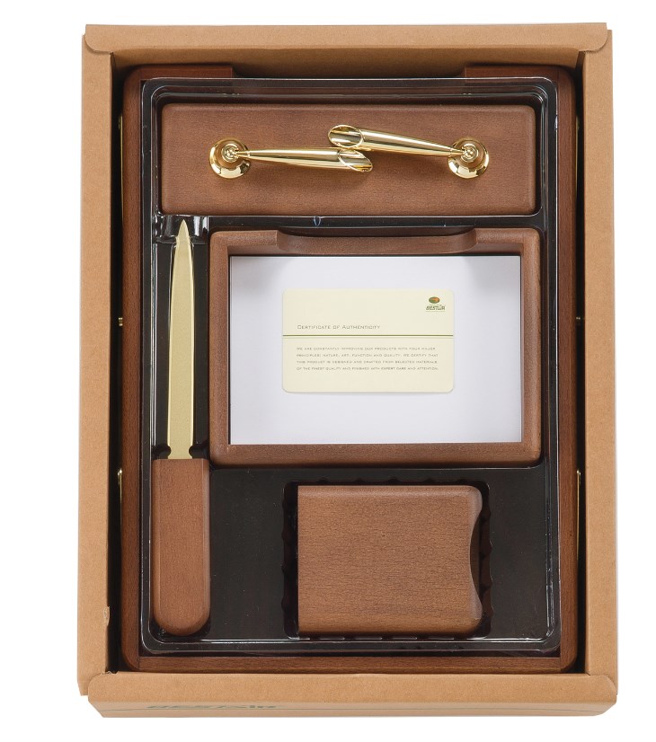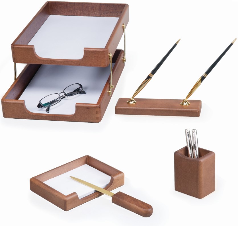 Настольный набор премиум-класса из дерева цвета "орех" с золотистой фурнитурой состоит из 5 предметов и содержит самое необходимое для организации комфортного и элегантного рабочего места.