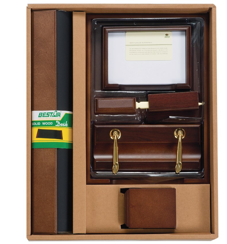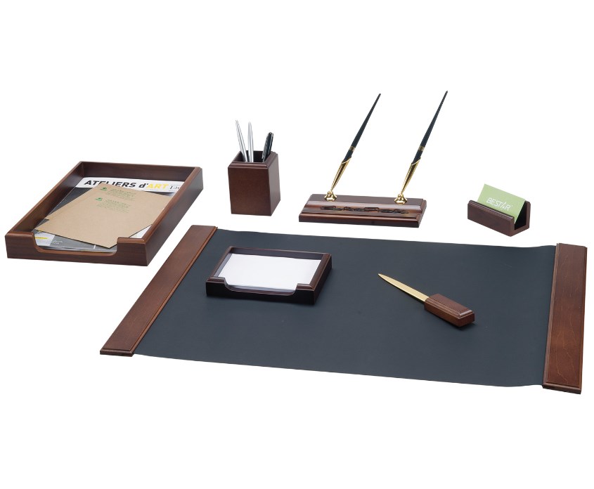 Настольный набор премиум-класса из дерева цвета "орех" с золотистой фурнитурой состоит из 7 предметов и содержит самое необходимое для организации комфортного и элегантного рабочего места.