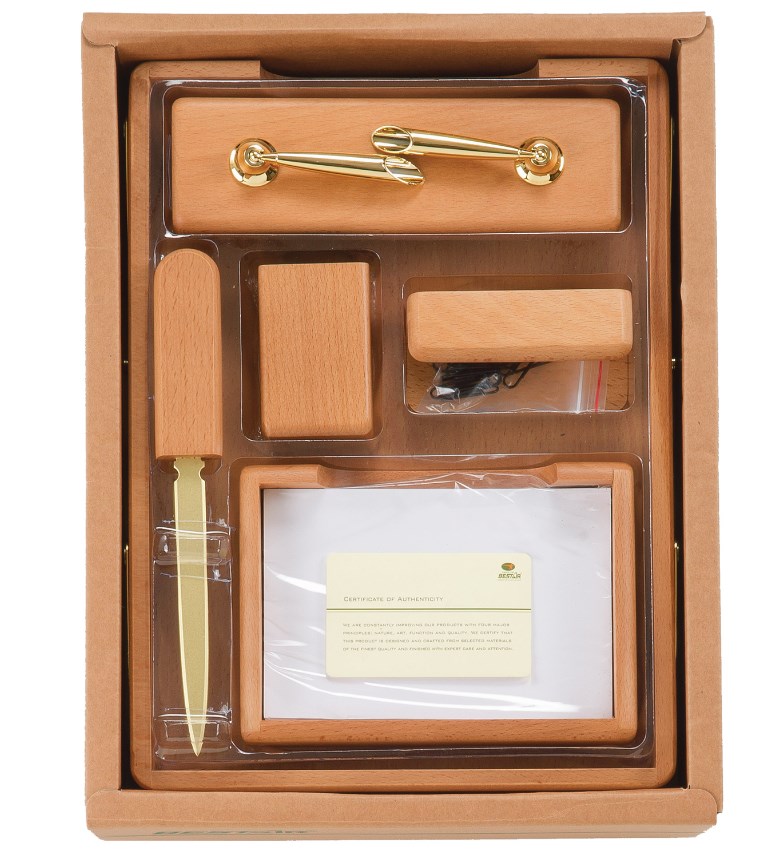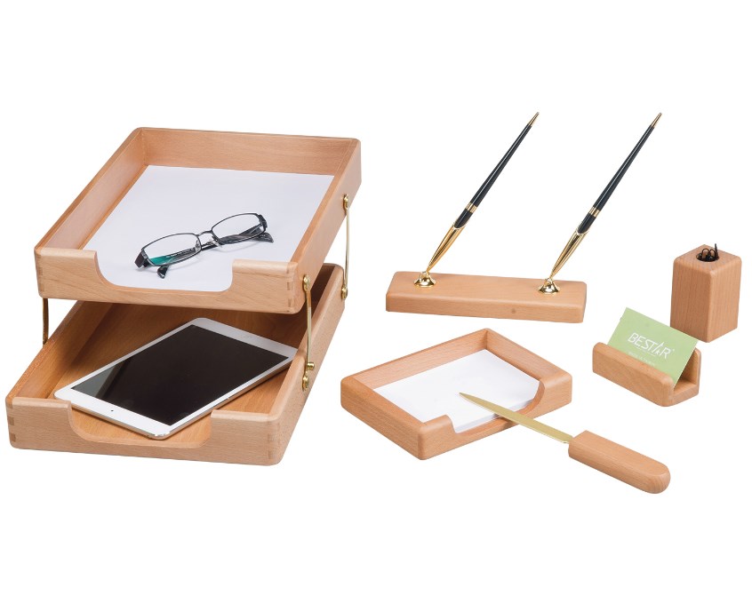Настольный набор премиум-класса из дерева цвета "дуб" с золотистой фурнитурой состоит из 6 предметов и содержит самое необходимое для организации комфортного и элегантного рабочего места.