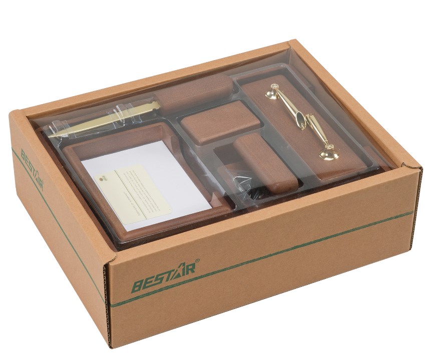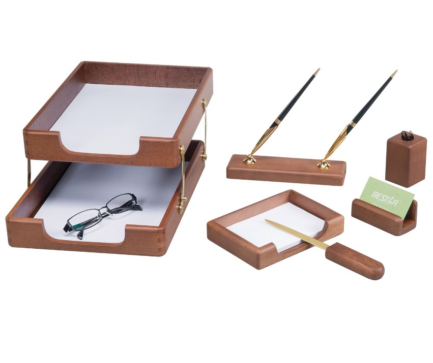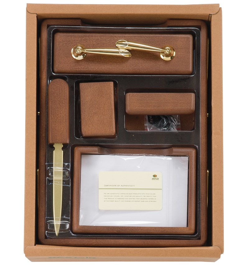 Настольный набор премиум-класса из дерева цвета "орех" с золотистой фурнитурой состоит из 6 предметов и содержит самое необходимое для организации комфортного и элегантного рабочего места.
