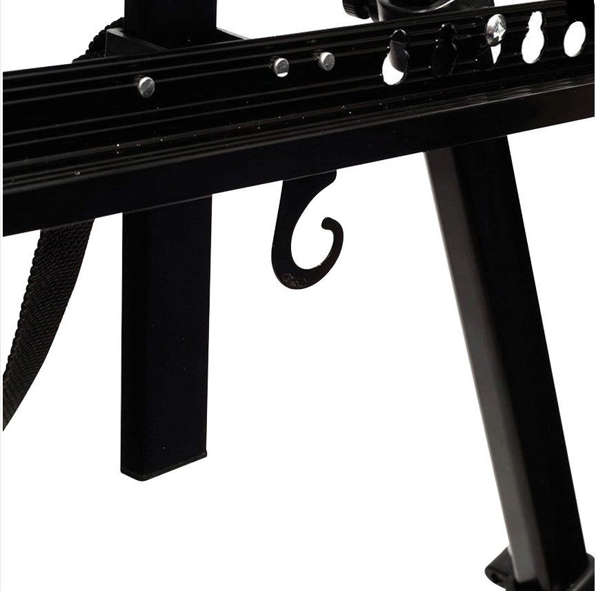 Мольберт оснащен держателем для кистей и крючком на который можно подвесить груз для придания устойчивости. Выдвижные ножки оснащены зажимами - клипсами, как у современных фото-штативов благодаря чему установка мольберта производится очень быстро.