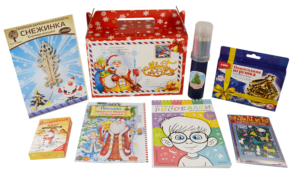 - В наборе: пенал-тубус, карандаши 18 цветов, раскраска-рисовалка, письмо Дедушке Морозу, плетение из бусин "Елочная игрушка", игра "Фанты новогодняя вечеринка", Сделай сам Волшебный снег, сборная модель "Снежинка"