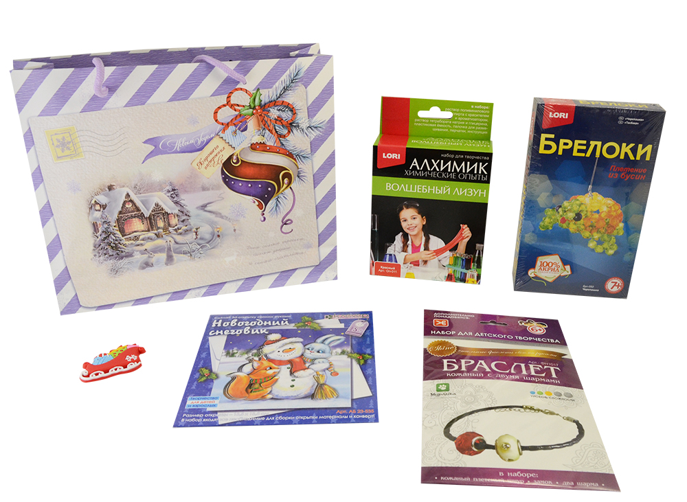 - В наборе: магнит новогодний в ассортименте, набор для открытки "Новогодний снеговик", набор для опытов Алхимик "Волшебный лизун", плетение из бусин Брелоки "Черепашка", набор для творчества "Браслет"
