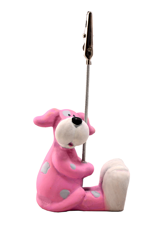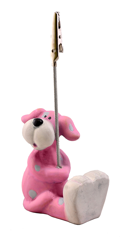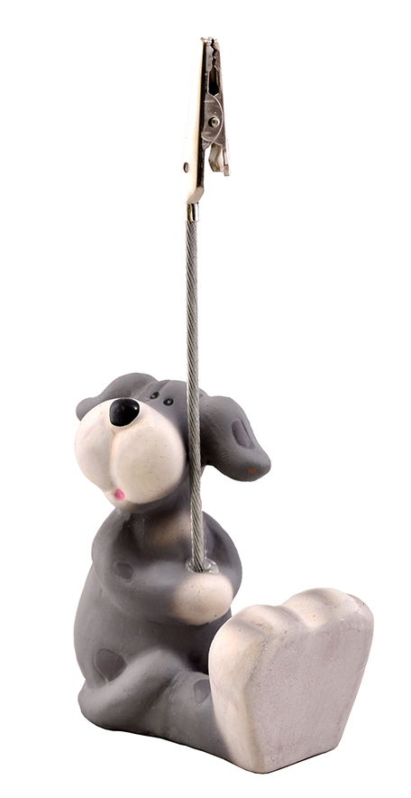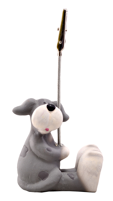 Небольшая настольная керамическая статуэтка в виде стилизованной собачки. Статуэтка оснащена направленным вверх металлическим тросиком с прищепкой, в которой лекго можно закрепить фотографию, карточку или табличку с надписью.