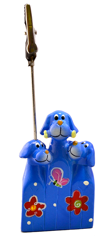 Небольшая настольная керамическая статуэтка в виде стилизованных собачек. Статуэтка оснащена направленным вверх металлическим прутиком с прищепкой, в которой лекго можно закрепить фотографию, карточку или табличку с надписью.