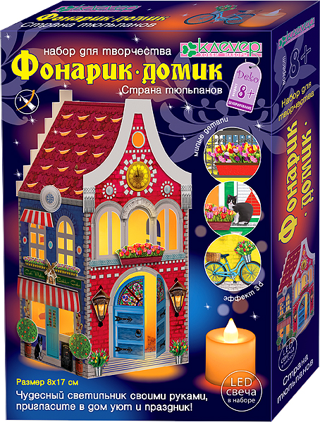 «Страна тюльпанов» - стильный голландский домик с характерными цветными стенами, узорной лепниной и изящными фонарями. А из 4х домиков можно создать яркую красочную улицу в голландском стиле, выстроив домики в линию разными фасадами вперёд! Ребёнок старше 8 лет легко с помощью тонкого и объёмного скотча украсит готовыми вырубными деталями красочные фасады, соберёт основу фонарика-домика, включит и поставит внутрь LED-свечу. Окошки домика осветят мягким тёплым светом комнату и сделают ярким и запоминающимся праздничный вечер!