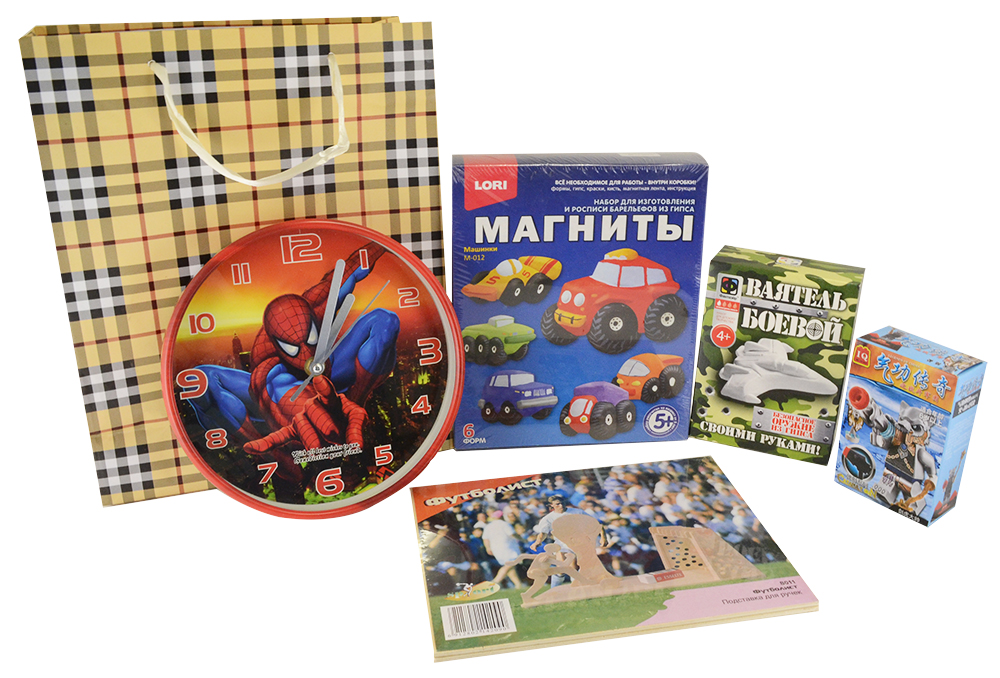 - В наборе: часы настенные, конструктор детский "Чимики", набор для изготовления и росписи магнитов "Машинки" ваятель"Боевой самолет", модель сборная деревянная "Футболист"