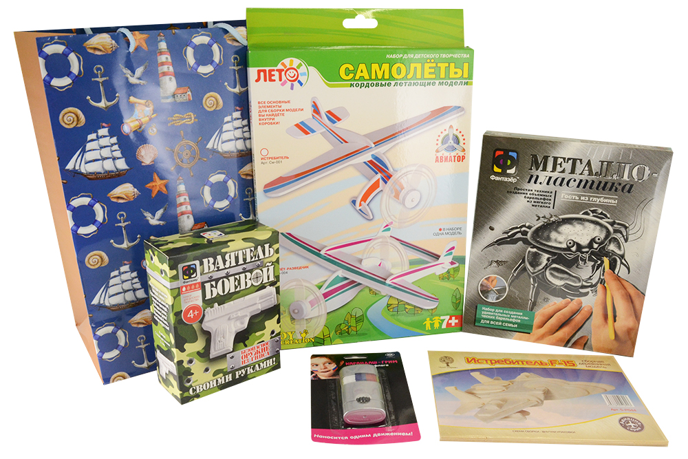 Отличный подарок для детей на 23 февраля, укомплектованный наборами для разных видов творчества. Упакован в красочный подарочный пакет.