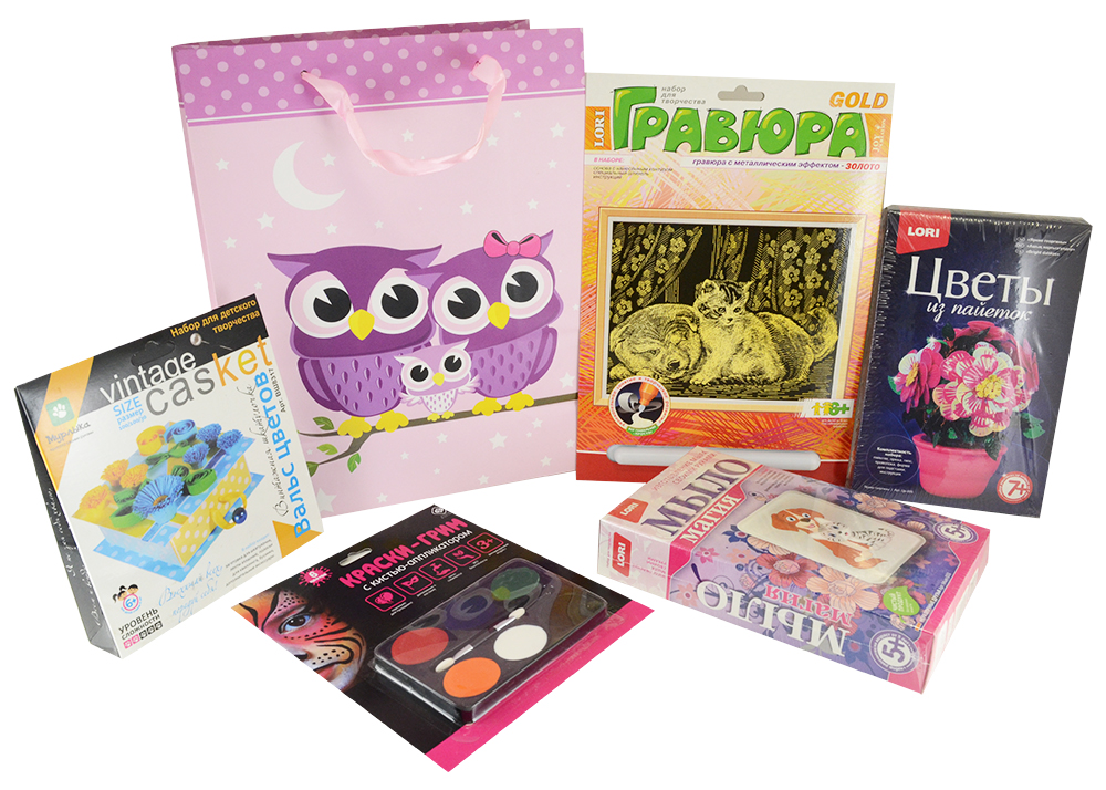 Отличный подарок для детей на 8 Марта, укомплектованный наборами для разных видов творчества. Упакован в красочный подарочный пакет.