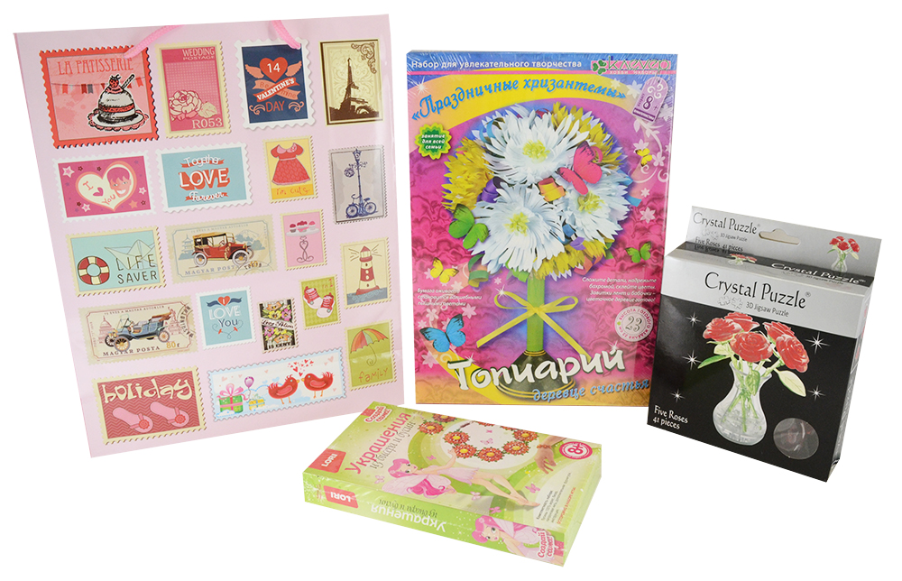 Отличный подарок для детей на 8 Марта, укомплектованный наборами для разных видов творчества. Упакован в красочный подарочный пакет.