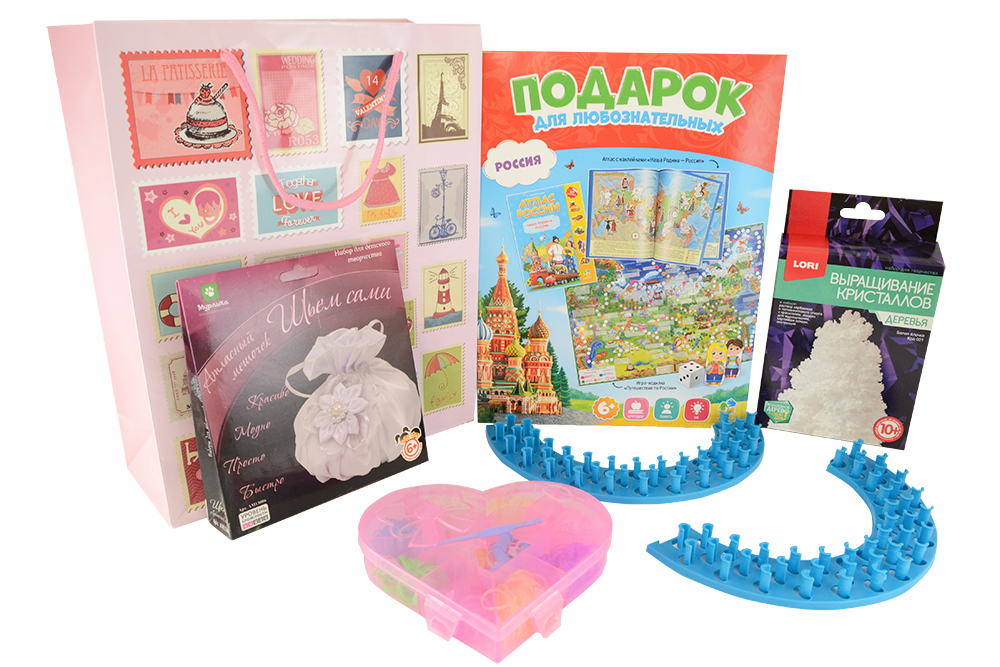 - В наборе: подарок для любознательных. Атлас с наклейками + игра ходилка, набор для плетения из резиночек "Сердце", шьем сами "Атласный мешочек", выращивание кристаллов "Деревья. Белая елочка", станок для плетения, подарочный пакет