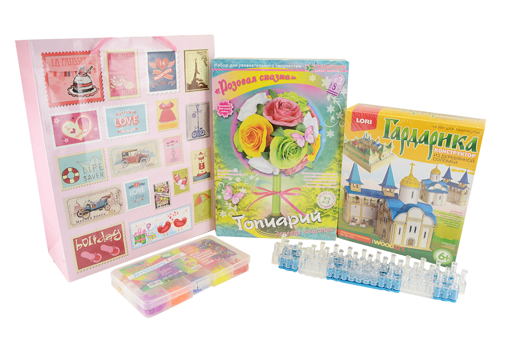 - В наборе: топиарий "Розовая сказка", конструктор из серии Гардарика "Соборный комплекс", набор для плетения из резиночек, станок для плетения, подарочный пакет