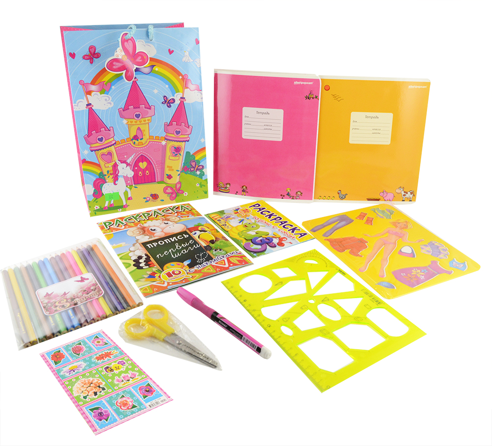 - В наборе: тетрадь 12 листов в клетку, тетрадь 12 листов в линию, трафарет "Катин гардероб", ножницы 11,5 см, ручка масляная 0,7 мм синяя, раскраска А6, раскраска А5 с наклейками, карандаши 18 цветов, линейка-трафарет "Сечение", лист с наклейками, пакет подарочный