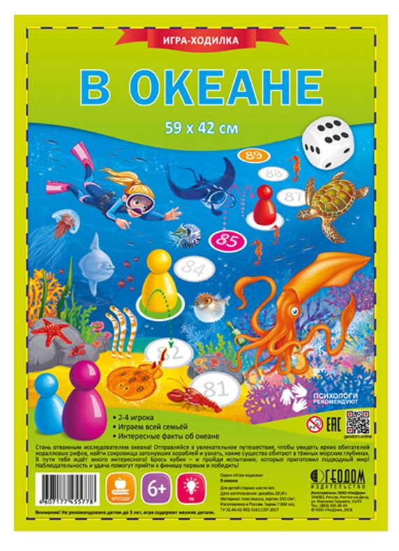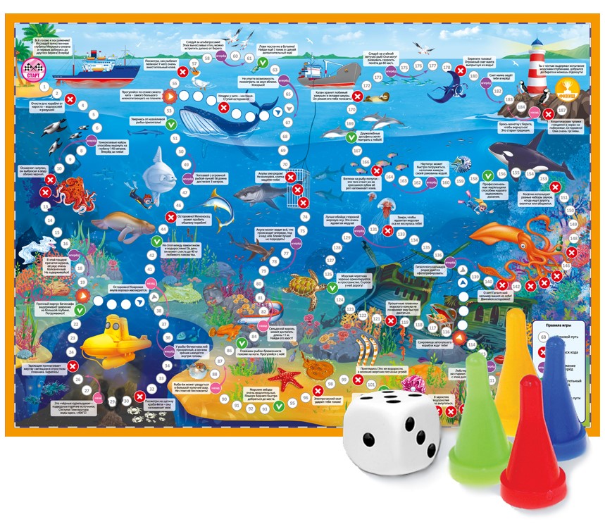 Настольная игра-ходилка для любознательных исследователей океана! Отправляйтесь в водные пучины и исследуйте подводный мир: знакомьтесь с обитателями коралловых рифов, ищите загадочные сокровища морских глубин, представителями водного мира - акулами, черепахами, ламантинами, крабами и бесчисленными видами рыб. Отправиться в путешествие можно всей семьей - в игре могут участвовать от 2х до 4х игроков. Чтобы приключения начались - просто бросайте кубик!