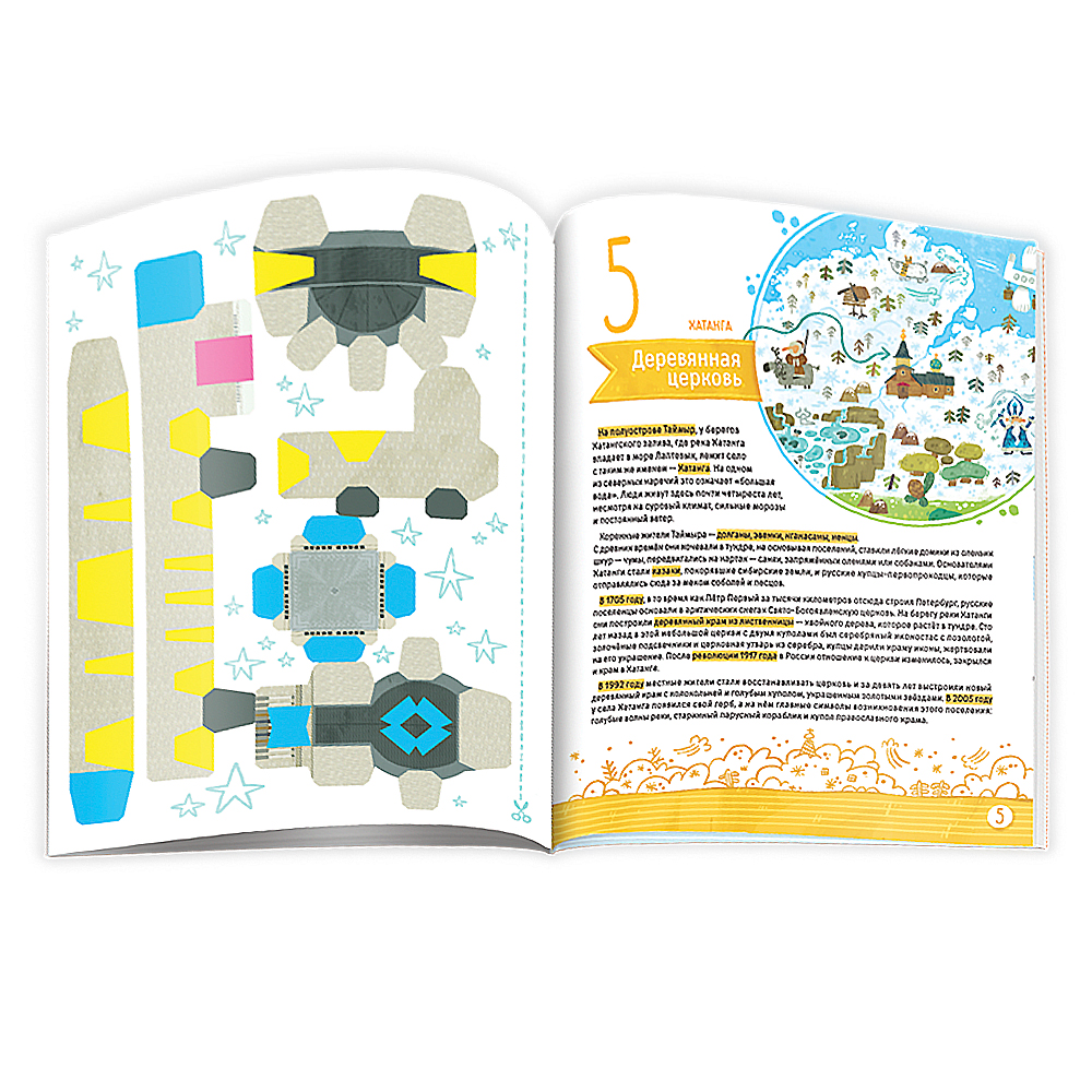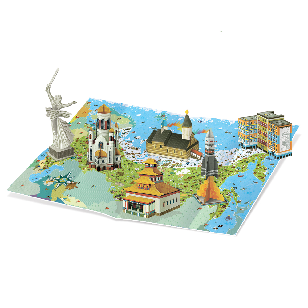Вы сможете самостоятельно собрать объёмные фигуры достопримечательностей с помощью клея и разместить на большой карте России, которая находится внутри.