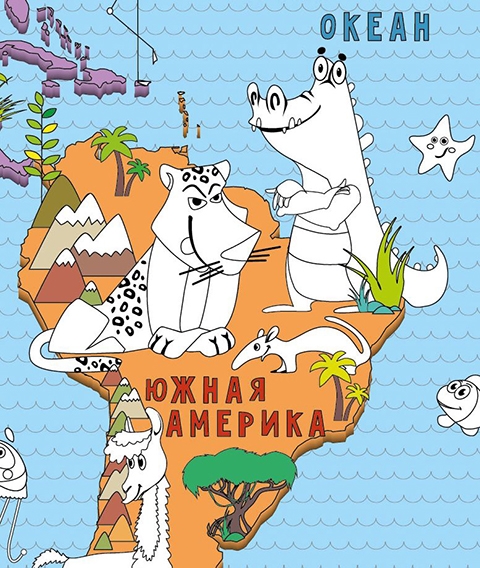 Необычный новый формат раскрасок - это большая карта мира. На карте изображены десятки интересных животных.