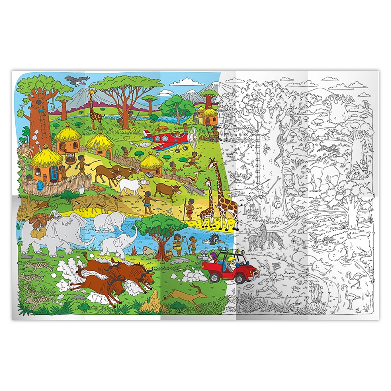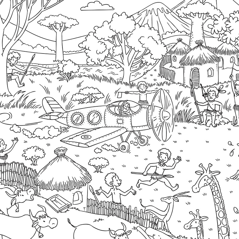 Благодаря этой раскраске можно побывать в африканской деревне: сходить на охоту, развести костёр и даже забраться на высокий баобаб.