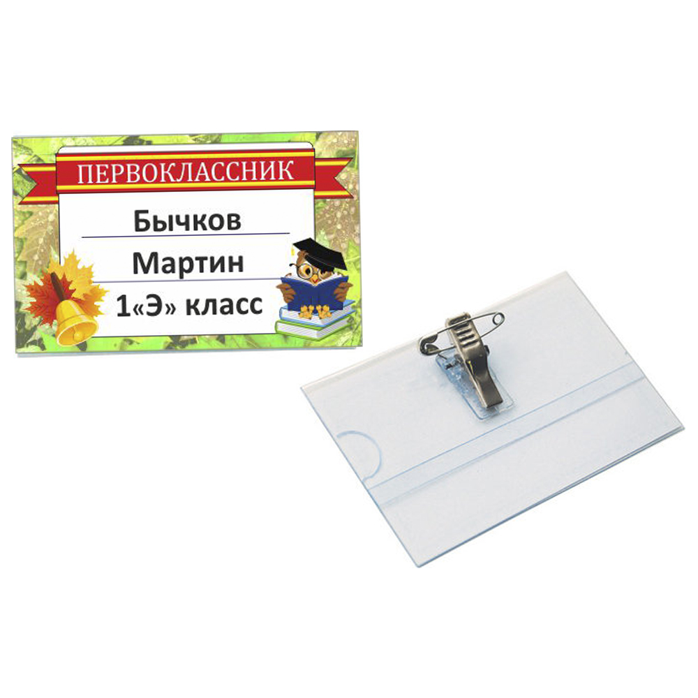 Именной бейдж для первоклассника из полипропилена размером 90*56мм имеет зажим металлический зажим и булавку.