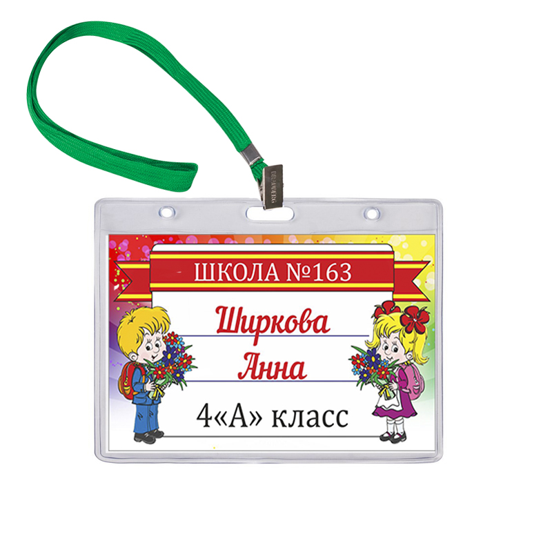 Именной бейдж для первоклассника из прозрачного мягкого пластика со шнурком.